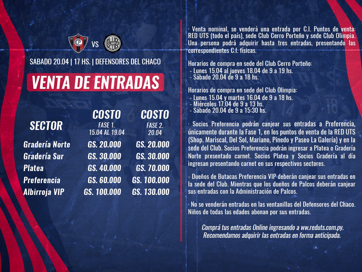 entradas se venderán en las sedes de Cerro Porteño, Olimpia y en todos los