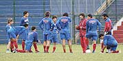 Los elegidos para el clásico de mañana. Salcedo, Cabrera, Báez, Cáceres, Pérez, Escobar, Fretes, Achucarro, Avalos (se ata los botines) y Cristaldo, cubierto por Barreto, durante la charla técnica en la pausa del entrenamiento del Ciclón. El entrenador Gustavo Costas recurre al mismo once y figura táctica que consiguió ganar la fecha pasada.