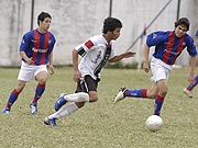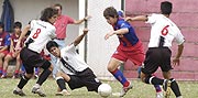 CERRO PORTEÑO (4) - TACUARY (1) Con toda su potencia, uno de los goleadores del torneo Clausura, Oscar Bóveda, elude a tres jugadores de Tacuary, quienes no pueden impedir su paso, en el partido de ayer en el que el Ciclón goleó por 4-1, en la Sub 17. En un partido sin sobresaltos, Cerro Porteño aplastó a un tibio conjunto de Tacuary.
