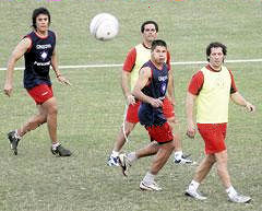 Erwin Lorenzo Avalos (en el fondo), Jorge Brítez, el técnico Pedro Troglio y su asistente Víctor Bernay, en el entrenamiento de Cerro Porteño. Erwin se ganó la titularidad.