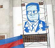 junto a otra persona, subió bien alto para pintar el retrato