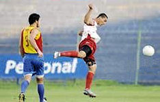 Pablo Noguera ingresó al equipo principal y tres minutos después marcó el gol de Cerro, tras este golpe de cabeza. El defensor fernandino, Bruno Silva, queda en el camino.