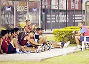 Después del puntilloso entrenamiento de fútbol, el técnico Javier Torrente apartó a los 11 para una charla, que se registró en uno de los sitios de los suplentes, en el Defensores. |