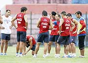 En una breve pausa del entrenamiento de ayer, el técnico Javier Torrente hace conocer a sus dirigidos su idea para alcanzar un alto nivel futbolístico. |