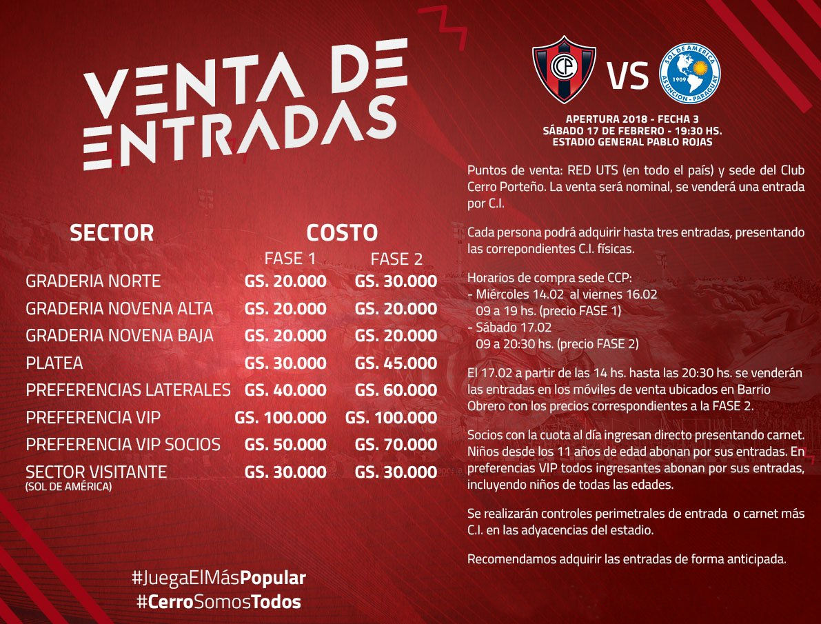 Cerro Porteño dio a conocer los detalles de precios y venta de entradas para el partido del sábado ante Sol de América en La Nueva Olla.