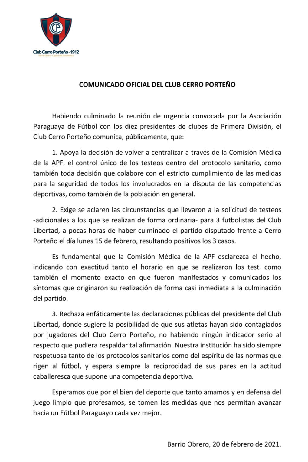 Cerro Porteño lanzo ayer un comunicado con relación a los casos