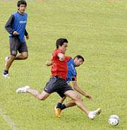 Mariano Campodónico deja en el camino a Alfredo Rojas y saca el remate que se convertirá en gol, en el ensayo de la víspera.(Fuente ABC Color)