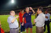 Recién cerca del mediodía de ayer se tuvo la suerte de estar en línea con el gerente del club y se consiguió el permiso para entrenar anoche a las 18:30 (19:30 de nuestro país) sobre el gramado del escenario del juego de hoy, pero cuando el plantel azulgrana arribó a la cita, grande fue la sorpresa al encontrar al “anfitrión” entrenando ante una gran cantidad de aficionados y en un estadio en plena etapa de construcción.
