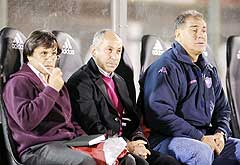 El nuevo entrenador de Cerro Porteño, el argentino Osvaldo Ardiles (c) ya estuvo en el banco en el partido ante Sol. A la derecha de Ardiles está su asistente Comisso y a su izquierda Cristaldo, el DT interino.