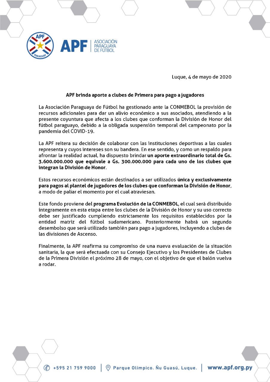 comunicó este lunes que brindará un auxilio económico de Gs. 300. 000.000 para