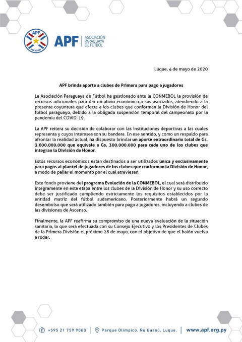 económico a clubes de Primera para pago de salarios También apuntó que el fondo
