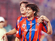 Con el gol que festejan Fretes (autor, de tiro libre) y Cabrera, se cerró la cuenta anoche en la Olla, donde el Ciclón goleo. |
