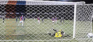 Nelson Cabrera, defensor de Cerro Porteño, con fuerte remate de penal puso anoche el 2-0 para el cuadro azulgrana ante el 3 de Febrero. El fuerte disparo de Cabrera fue al lado derecho del arquero Agüero que hizo un gran esfuerzo, tratando de contener el envío del cerrista. |