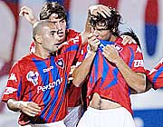 Walter Fretes besa su camiseta después de convertir el primer gol para Cerro. Cristaldo y Cabrera lo felicitan. |