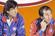 El técnico de Cerro Porteño Gustavo Costas y su asistente Rubén Rivas. "No es precisamente un reacondicionamiento físico", aclaró el PF físico Alexis Miguel Cortés al tiempo de explicar que se intensificará también la parte táctica y que se decidió hacer este plan para aprovechar mejor el tiempo del futbolista y cuidar su alimentación.