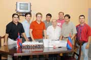 Componentes de la organización “Renacer Azulgrana”, encabezada por Emilio Vera, junto a los medicamentos que se entregaron ayer al directivo, Dr. Clodomiro Marecos. (Fuente ABC Color) |