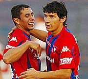 Jorge Achucarro y Roberto Ovelar festejan la concreción del gol que cerró la cuenta ayer en barrio Obrero. |
