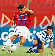 Roberto Ovelar saca el potente remate para convertir el cuarto gol del Ciclón, ayer en la Olla ante el 12 de Octubre. |