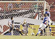 Carlos Báez ya sacó el remate de zurda y la pelota va camino a las redes. ‘‘Aquiles’’ marcó el gol para el triunfo de Cerro Porteño anoche en la ‘‘Olla’’. Carlos "Aquiles" Báez no estuvo por suspensión en los dos partidos de la Copa Sudamericana ante Libertad y en el de ayer, por el torneo Clausura, el capitán de Cerro Porteño fue autor del único gol para la victoria y, al decir de él, esta virtud no fue otra cosa que "la zurda de mi papá (Carlos Báez Vargas)".