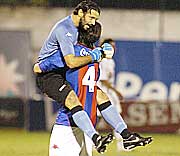 Festejan Diego Barreto y Nelson Cabrera, al terminar el juego de ayer, en la Olla.